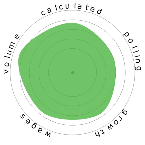 The Snowflake is a visual summary of the five badges: Automation Risk (calculated), Risk (polled), Growth, Wages and Volume. It gives you an instant snapshot of an occupations profile. The colour of the Snowflake relates to its size. The better the occupation scores in relation to others, the larger and greener the Snowflake becomes.